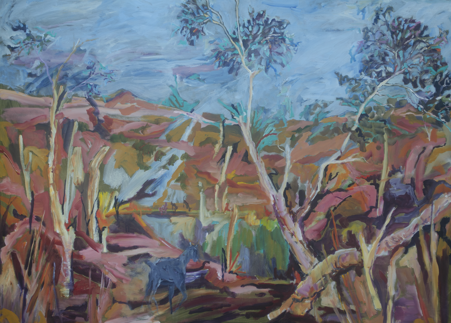 Semi Abstracted view of water, surrounding earth and  goats