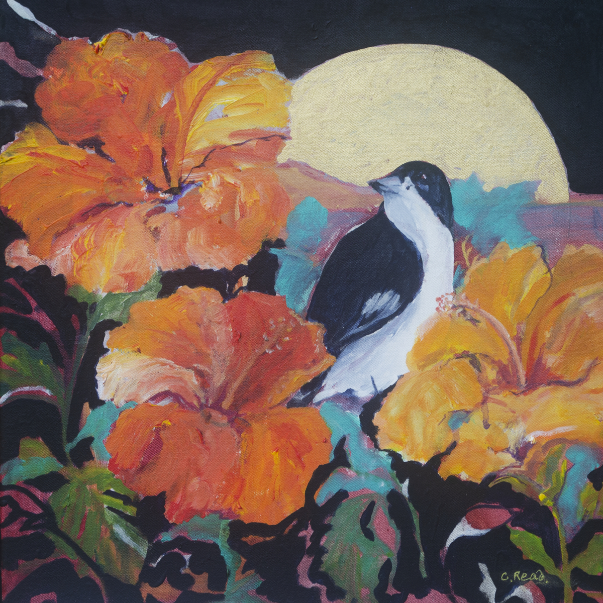Hibiscus flowers with bird and gold moon