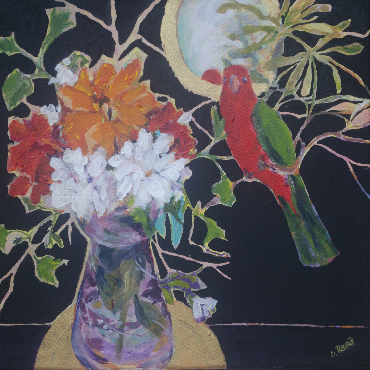 Still life, vase with flowers and parrot with mirror behind