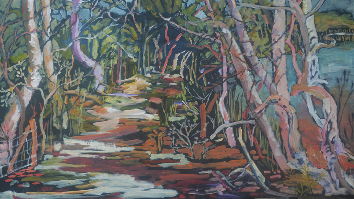 Semi abstract landscape with path, trees and lake contrasting colours