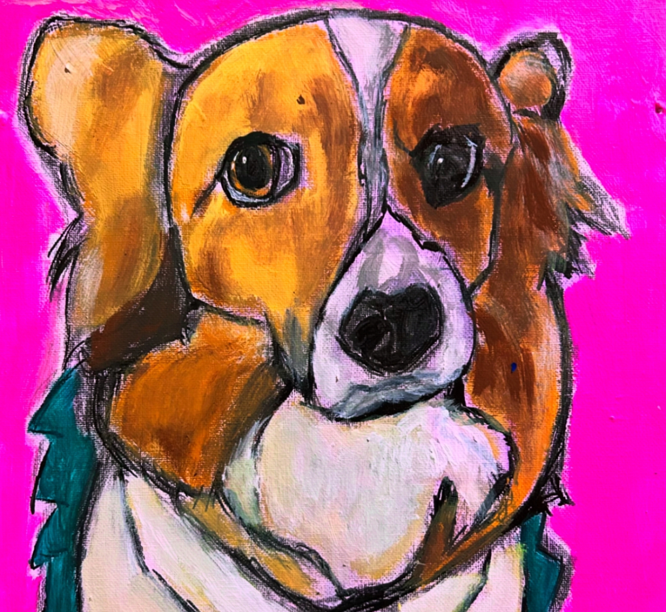 The painting is an acrylic portrait of a beagle on a hot pink background. The dog has a golden-brown coat with white markings on its muzzle and chest, and expressive black eyes. The style is vibrant and impressionistic, with bold brushstrokes and a colorful, playful aesthetic typical of pet portrait work.
