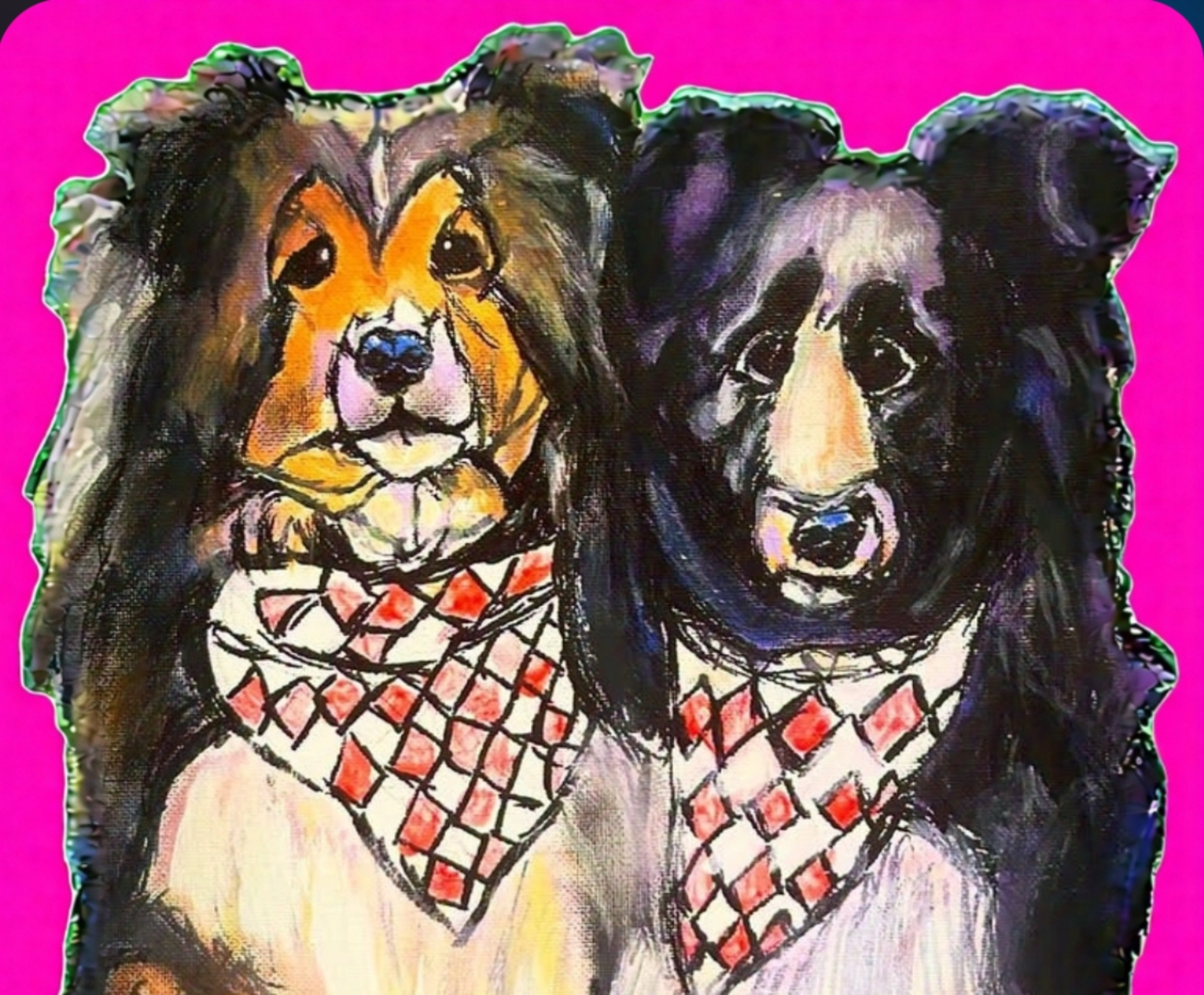 The painting depicts two expressive acrylic portraits of dogs positioned side by side against a vibrant hot‑pink background. Both dogs wear white bandanas printed with a red diamond pattern. The dog on the left has a tan-and‑black coat with a lively, forward‑facing expression, while the dog on the right is black with a white muzzle and a softer gaze. The brushwork is bold and impressionistic, capturing texture and color to convey joyful, pet‑centric realism.