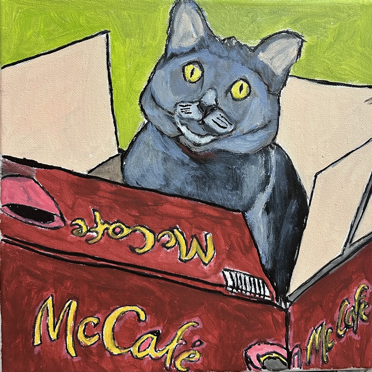 The painting depicts a gray cat with bright yellow eyes sitting inside an open red McCafe box (the box is labeled “McCafe” in yellow cursive lettering). The cat has a subtle smile and is positioned against a vibrant green background, giving the scene a playful, colorful impressionist feel rendered in acrylics.