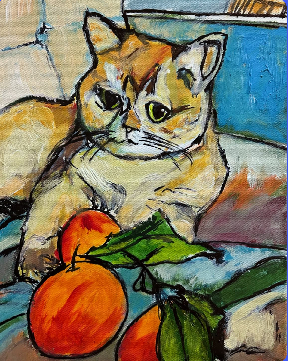 The painting is an acrylic, impressionist-style portrait titled “Citrus Whiskers.” It depicts an orange tabby cat lounging beside two vibrant orange citrus fruits with green leaves, rendered with bold black outlines and expressive brushstrokes that capture light and texture. The color palette—bright oranges, blues, and greens—evokes the sunny atmosphere of Palm Springs/Coachella Valley, blending pet portraiture with a joyful, impressionist sensibility inspired by artists like Monet.