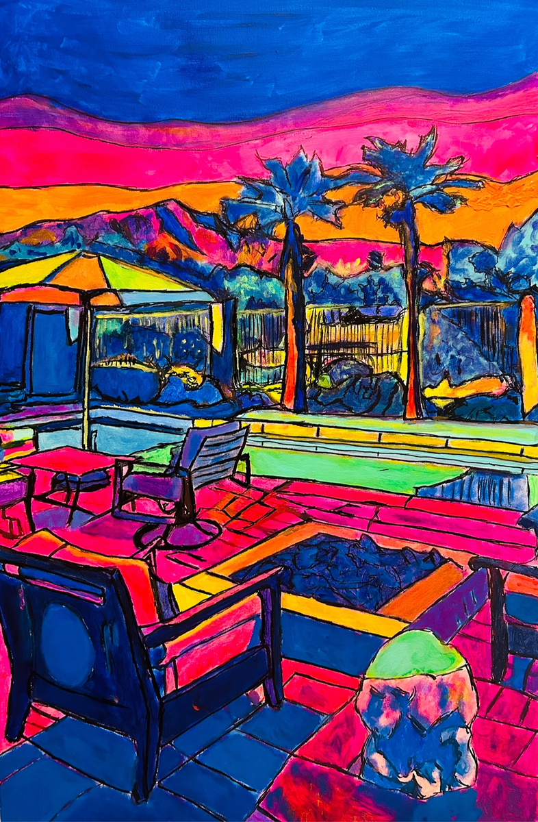 The painting depicts a vibrant, stylized outdoor patio scene rendered in bold, saturated colors and expressive brushwork.