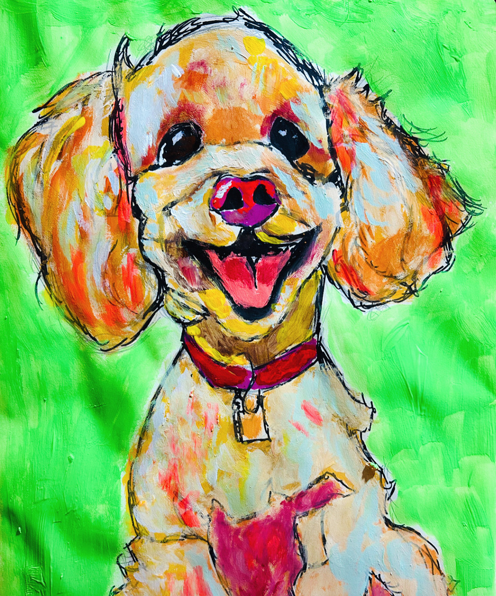 This vibrant acrylic painting depicts a joyful, stylized portrait of a small dog with floppy ears, rendered in a colorful, impressionistic manner. The dog has a bright red collar with a gold tag and is set against a vivid green background that emphasizes the cheerful expression and energetic brushwork. The artist captures the pet’s personality through bold color contrasts and expressive linework, conveying a sense of playfulness and warmth typical of contemporary pet portraiture inspired by Impressionist techniques.