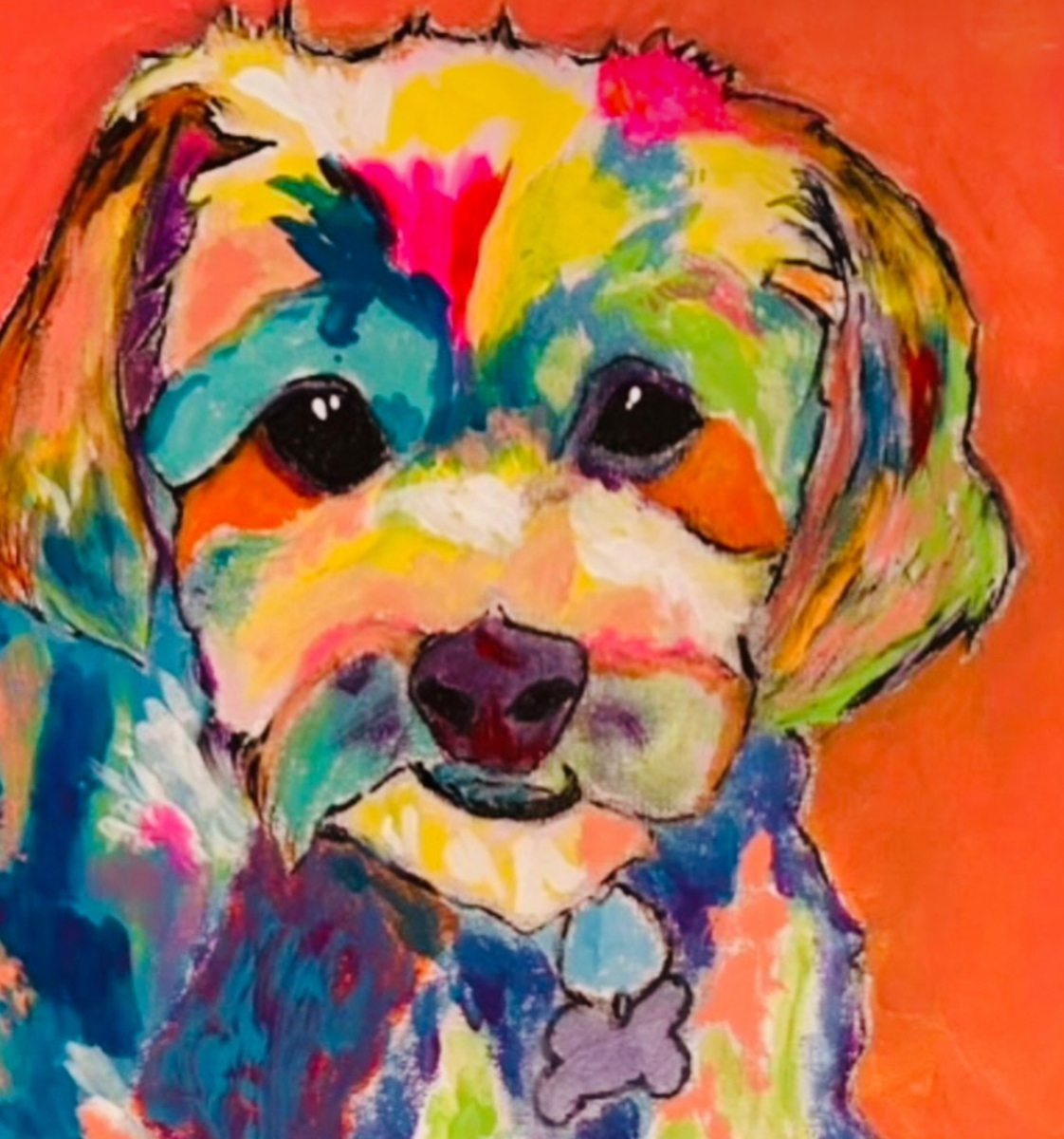 The painting is a vibrant acrylic portrait of a puppy rendered in an impressionist style. The dog’s face is composed of layered, saturated colors—bright yellows, blues, pinks, greens, and oranges—blended to create a luminous, textured effect. Black outlines sharpen the facial features, emphasizing expressive eyes and a soft nose. The background is a solid, warm orange that makes the multicolored fur pop. The overall feel is playful, joyful, and celebrates the beauty of the subject through bold, impressionistic brushwork.