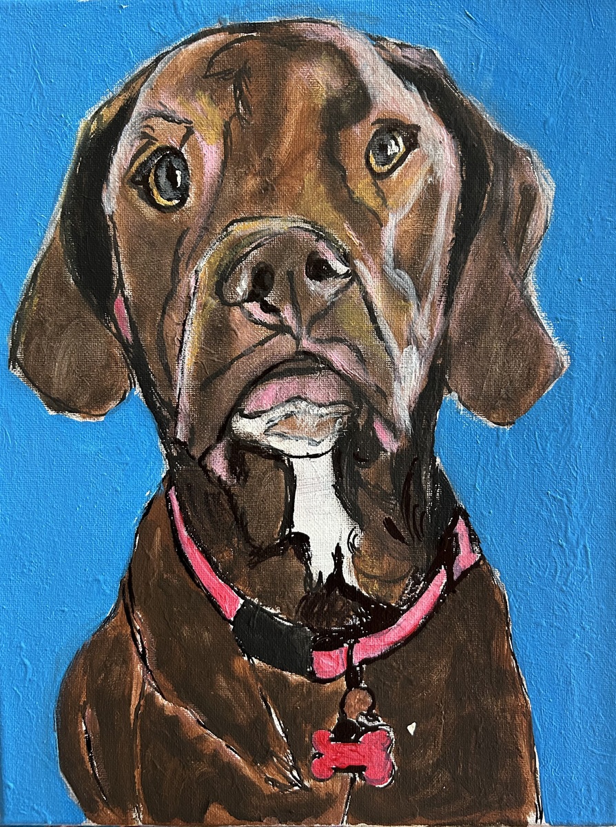This acrylic painting is a vibrant, impressionist portrait of a brown dog with a white muzzle, wearing a pink collar and a red bone-shaped tag against a bright blue background. The expressive brushwork captures the dog’s curious gaze and soft fur texture, emphasizing bold color contrasts inspired by the artist’s love of Palm Springs hues and Monet’s impressionist style. The piece celebrates the joy of pet portraiture and conveys the artist’s signature vibrant, joyful aesthetic.