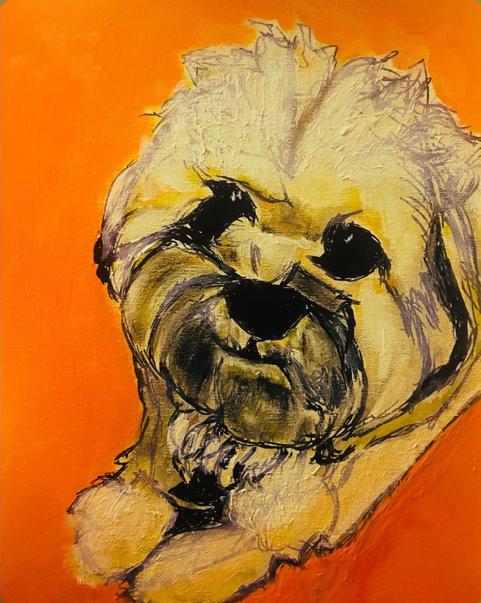 The painting is an acrylic portrait of a fluffy white puppy with expressive black eyes and nose, rendered in a loose, impressionistic style. The dog’s head is set against a vivid orange background that makes the subject pop. Bold brushstrokes and a mix of light yellow‑gold tones give the fur a soft, textured feel, while strong black outlines define the facial features, capturing the animal’s playful, cozy personality. The work conveys warmth and joy, celebrating the charm of a pet in vibrant color.