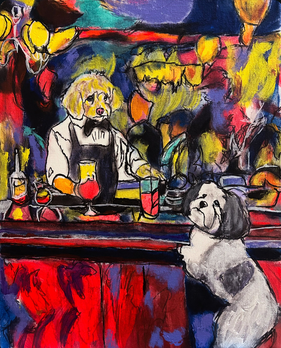 The painting is an acrylic, impressionist-style work depicting a vibrant bar scene titled “Doggybar.” A stylized bartender with blond hair, wearing a white shirt, black bow tie, and apron, stands behind a red counter serving drinks in colorful glasses alongside a bottle. In the foreground, a black-and-white dog sits on a stool at the bar, looking up at the bartender. The background bursts with energetic yellow, red, blue, and purple brushstrokes suggesting lively ambient lighting and abstract patrons, evoking the atmosphere of a fun, whimsical nightlife setting that celebrates pets.