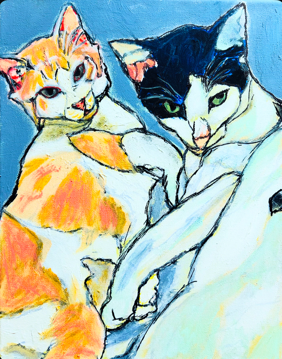 The painting is an acrylic work on canvas depicting two stylized cats positioned side‑by‑side. The orange tabby on the left has white markings, expressive eyes, and a playful posture, rendered with bold orange, yellow, and pink brushstrokes outlined in black. The black‑and‑white cat on the right has green eyes and a sleek, contrasting fur texture, painted with vivid blues and whites, also outlined in black. The background is a solid blue sky, emphasizing the vibrant, impressionistic color palette and energetic line work that captures the affectionate interaction between the two animals.