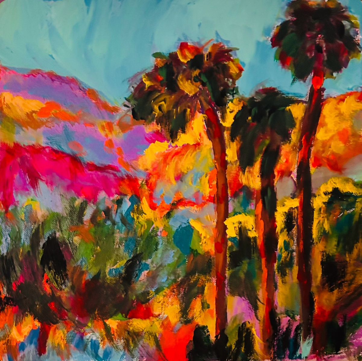 The painting is an impressionist acrylic work that depicts a vibrant landscape featuring three tall palm trees set against a colorful, expressive sky and mountain backdrop. The scene bursts with bold, saturated hues of pink, orange, yellow, red, and blue, layered with energetic brushstrokes that capture the atmospheric light and mood of the Coachella Valley environment. The artist uses thick, textured application of acrylic to convey the lively, sun-kissed essence of the setting, evoking the influence of Monet and impressionist techniques.