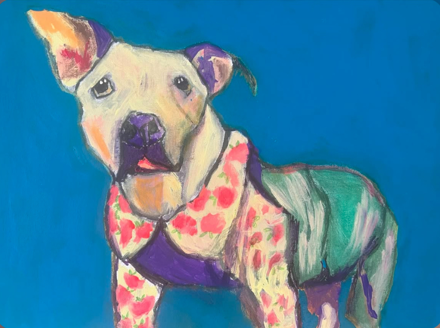 The painting depicts a white pit bull–type dog wearing a colorful bandana with pink floral patterns on a cream background. The dog is rendered in vibrant acrylic strokes with impressionist flair, showing purple shading on its muzzle and ears, orange highlights on the ear, and green accents on its chest and shoulder. The background is a solid bright blue, making the colorful, expressive portrait pop with energy and joy, typical of vibrant pet portrait work inspired by impressionist techniques.
