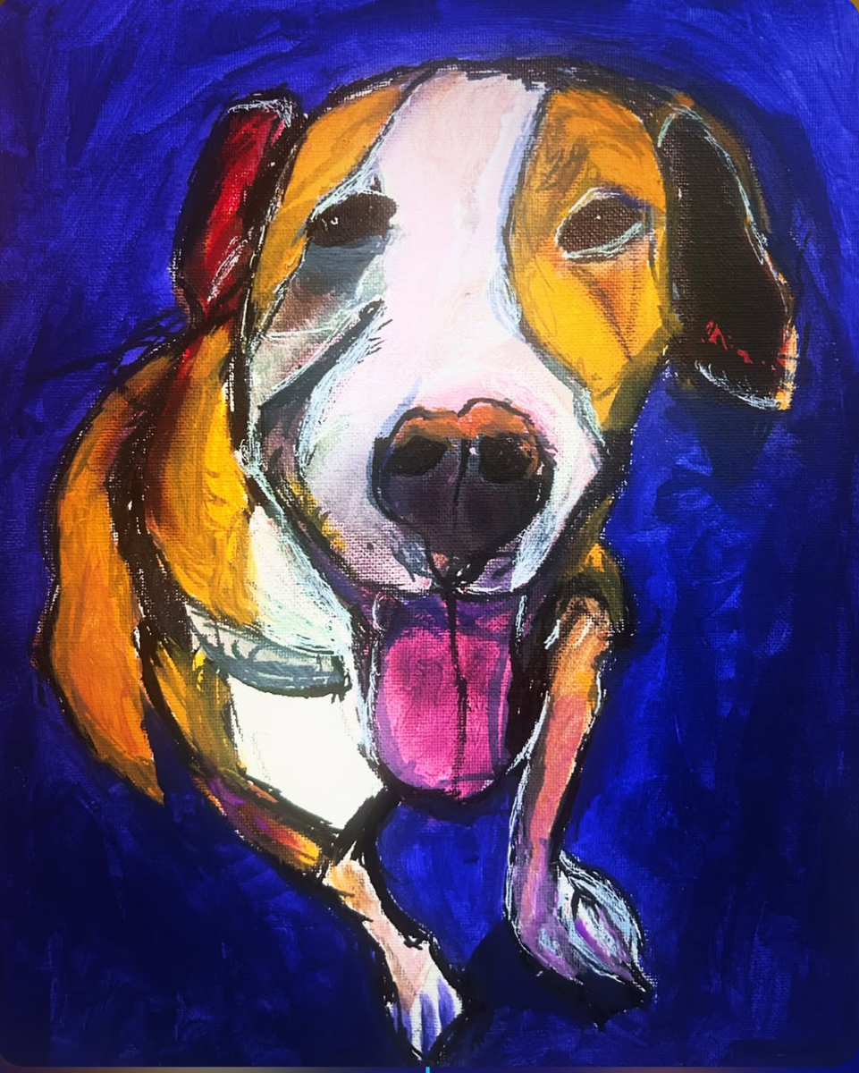 The painting is an acrylic portrait of a dog rendered in a vibrant, impressionistic style. The canine has a white muzzle with tan patches over the eyes and ears, a black nose, and a bright pink tongue hanging out of its open mouth. The background is a rich royal‑blue that contrasts sharply with the bold, expressive brushstrokes used for the dog’s fur and features. The artwork emphasizes color and energetic texture to capture the animal’s lively expression and personality.