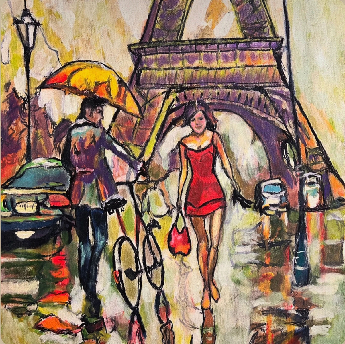 The painting depicts an impressionistic, vibrant street scene in Paris rendered in acrylics with bold colors and expressive brushstrokes. In the foreground, a man in a purple jacket walks away from the viewer under a yellow umbrella toward the Eiffel Tower, which dominates the background. A woman in a red dress strides forward carrying a red purse, positioned centrally in the composition. The setting includes sketched streetlights and a blue car on the left, conveying a lively, atmospheric urban moment inspired by Impressionist techniques.