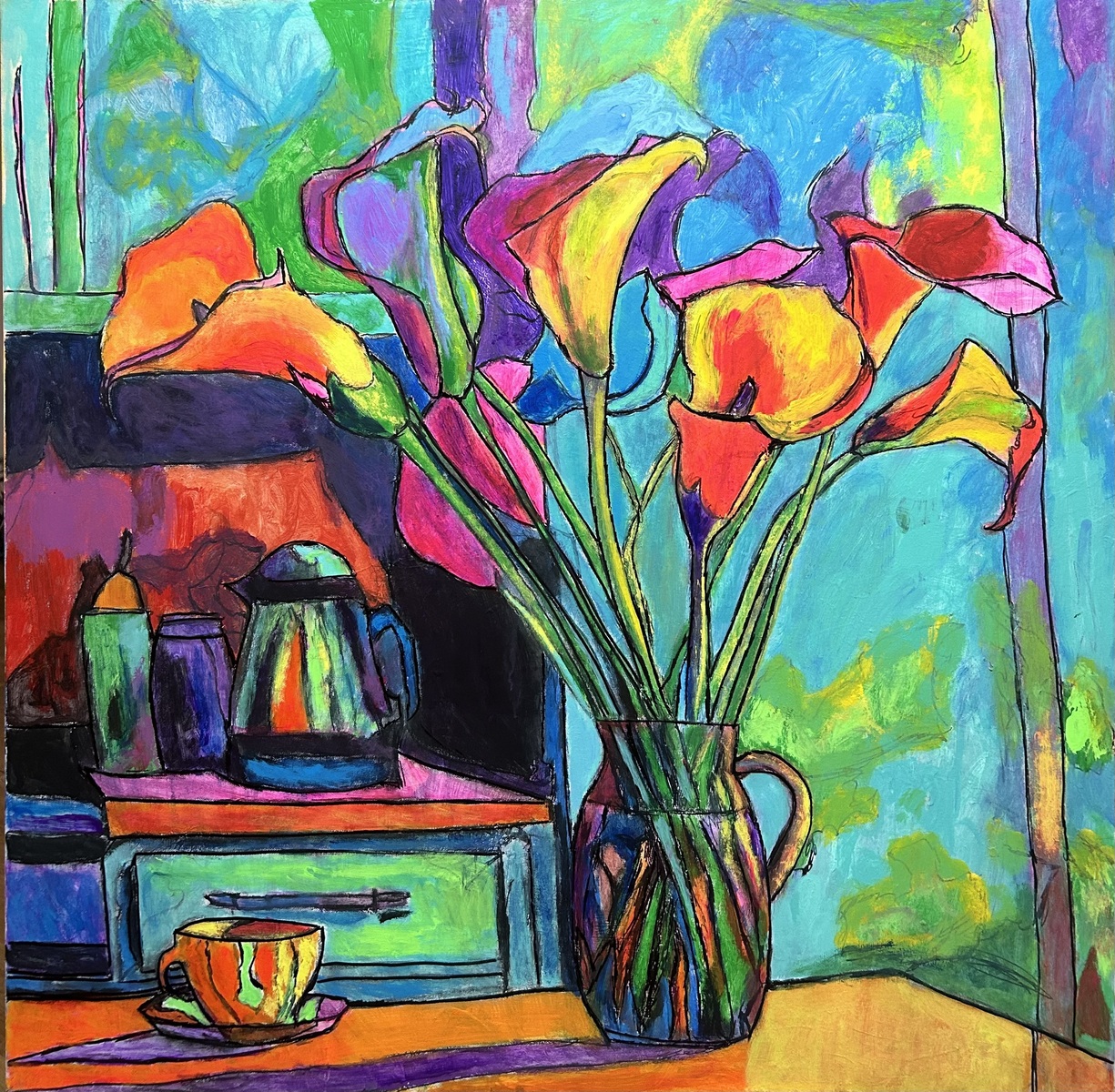 The painting is a vibrant acrylic still life featuring a bouquet of colorful calla lilies in a glass pitcher vase set on a table. In the foreground, an orange‑yellow cup with green accents sits on a saucer beside the vase. Behind the vase is a small cabinet holding a green kettle and a blue jar with an orange lid. The background shows a window with bright, abstract greens and blues suggesting outdoor foliage, reflected in the glass. The entire scene is rendered with bold, expressive brushstrokes and a saturated, impressionistic color palette that emphasizes luminosity and joy.