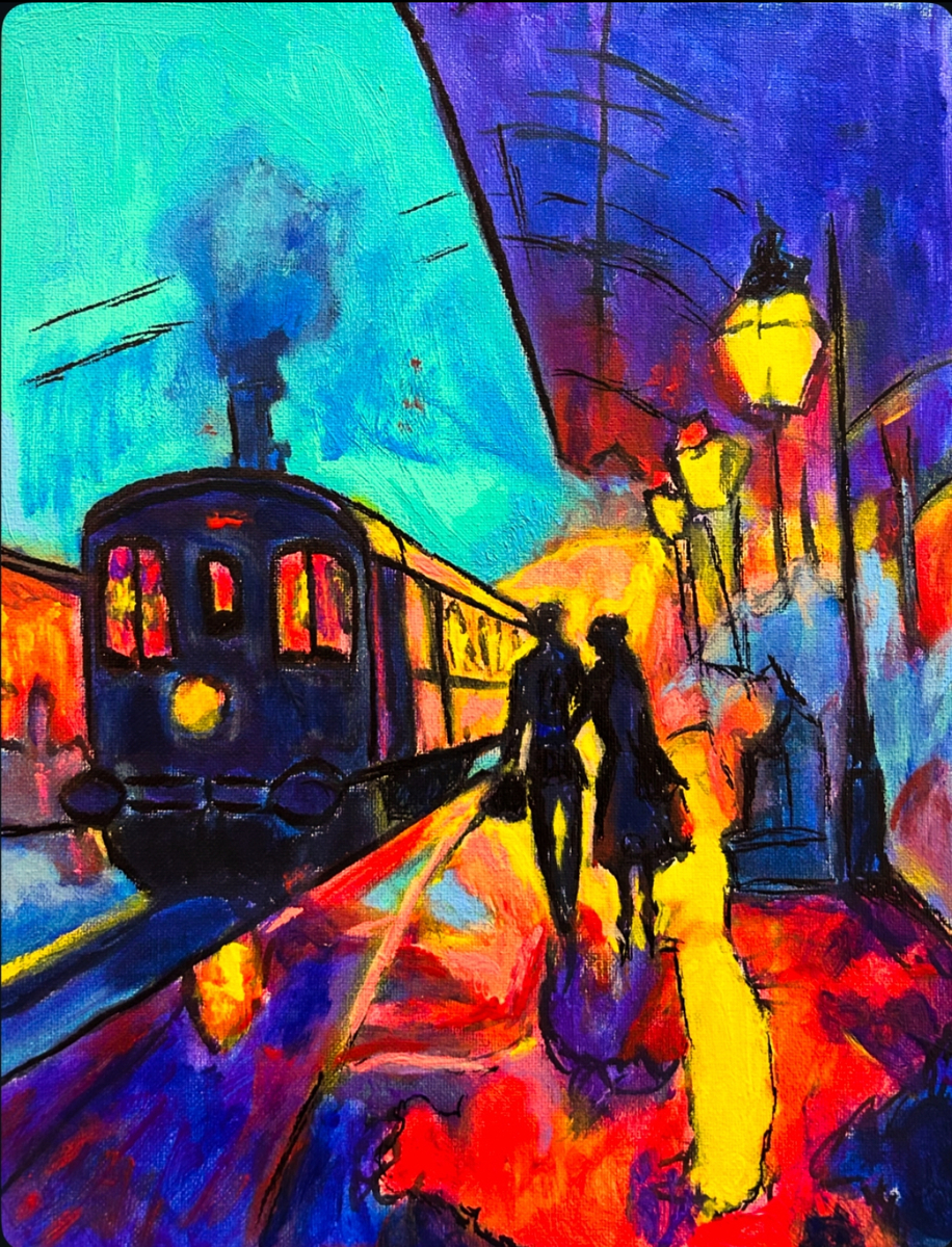 The painting is an acrylic, impressionist-style work that depicts a vibrant nighttime street scene. A dark blue train with glowing red windows and a smoky plume sits on the left, facing a couple in silhouette who are walking hand-in-hand down the yellow-lit street toward the viewer. The right side features a yellow streetlamp casting warm light onto the red-orange pavement, contrasting with bold blue and purple shadows. The energetic brushwork and saturated, mixed colors give the scene an expressive, atmospheric feel reminiscent of urban impressionism.