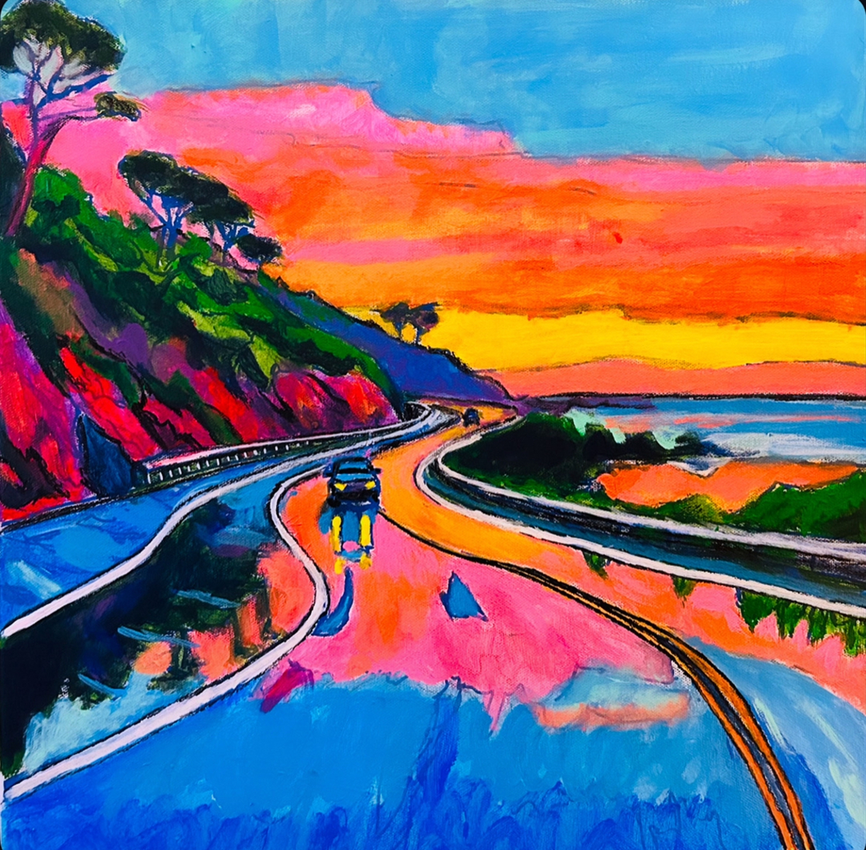 The painting depicts a vibrant, impressionistic landscape rendered in acrylic. A winding, two-lane road curves down a hillside toward a distant shoreline or valley, framed by lush green foliage and slender trees on the left. The sky bursts with a dramatic, colorful sunset gradient of pink, orange, and yellow that blends into a bright blue upper atmosphere. The scene is executed with bold, expressive brushstrokes and a vivid, saturated color palette that emphasizes the energetic feel of the Coachella Valley-inspired scenery.