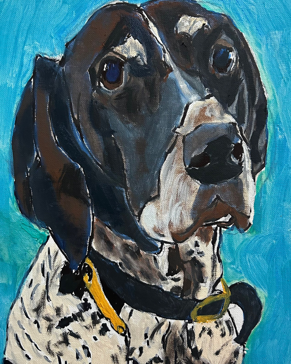 The painting is an acrylic portrait of a black‑and‑white spotted dog with floppy ears, rendered in a vibrant, expressive style. The dog’s head is positioned in a three‑quarter view, looking slightly to the right, with large, soulful eyes and a glossy black nose. It wears a black collar highlighted with a yellow buckle. The background is a bright blue wash with subtle greenish streaks, giving the scene an impressionistic, energetic feel that emphasizes color and texture. The brushwork is bold and loose, capturing the animal’s personality and the lively atmosphere of the setting.