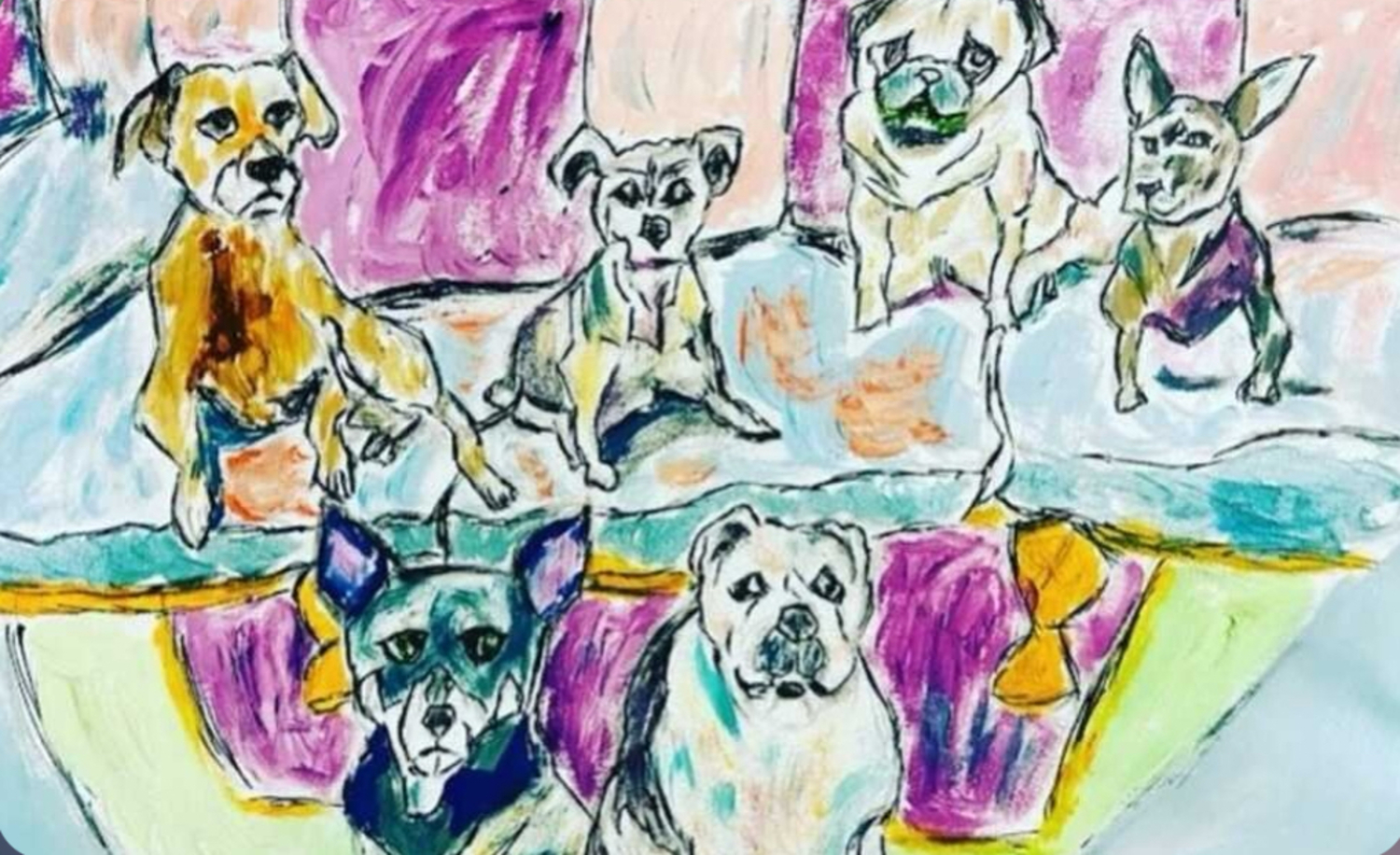 The painting depicts six dogs arranged in two rows of three, rendered in a vibrant, expressive acrylic style with bold brushstrokes and colorful backgrounds. The dogs are sketched with energetic line work and bright, mixed hues that give them individual personalities and vivid coats—golden, white, tan, and blue-gray tones are mixed with purple, pink, and green accents in the setting. The composition suggests an impressionistic, celebratory pet portrait that captures joyful energy and playful atmosphere, emphasizing the lively colors inspired by the artist’s Palm Springs palette.