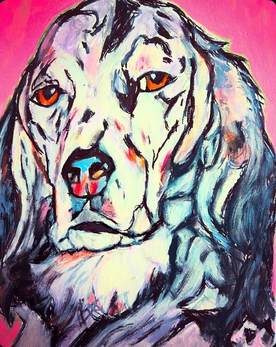 The painting is an acrylic portrait of a dog rendered in a vibrant, impressionist style. The dog has a white face with expressive orange eyes and a black nose highlighted with pink and blue accents. Its long, floppy ears are shaded in blues and blacks, set against a bright pink background that makes the subject pop. The brushwork is bold and textured, giving the piece an energetic, colorful feel typical of contemporary pet portraiture inspired by impressionist techniques.