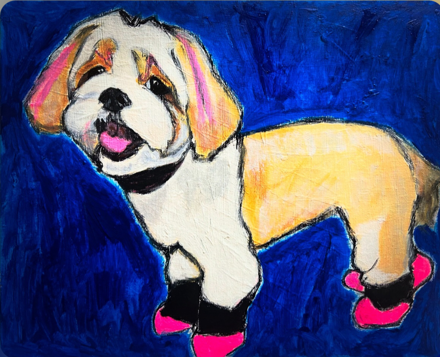 The painting is an acrylic portrait of a cheerful puppy with a white face and chest, tan ears and hindquarters, wearing bright pink shoes set against a deep blue background. Bold black outlines accentuate the form, and vibrant pink highlights add a playful, impressionist touch inspired by Palm Springs colors, capturing the joyful spirit of a colorful pet portrait.