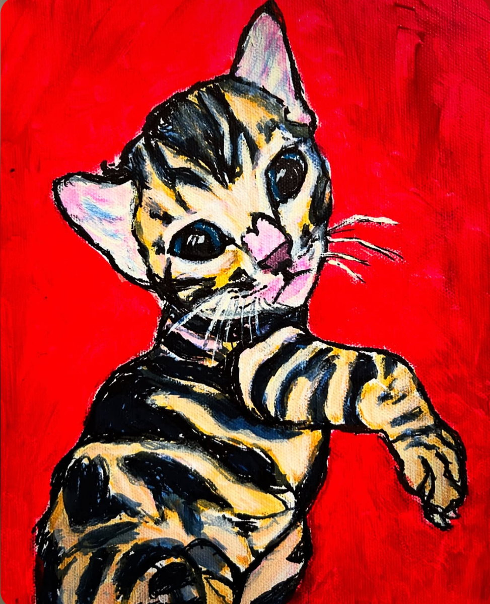 The painting is an acrylic portrait of a playful tabby kitten with golden fur and black stripes, set against a vivid red background. Bold black outlines define the form, while pink highlights accentuate the nose and inner ears, capturing an expressive, whimsical impression of a pet with energetic charm inspired by colorful, impressionist techniques.