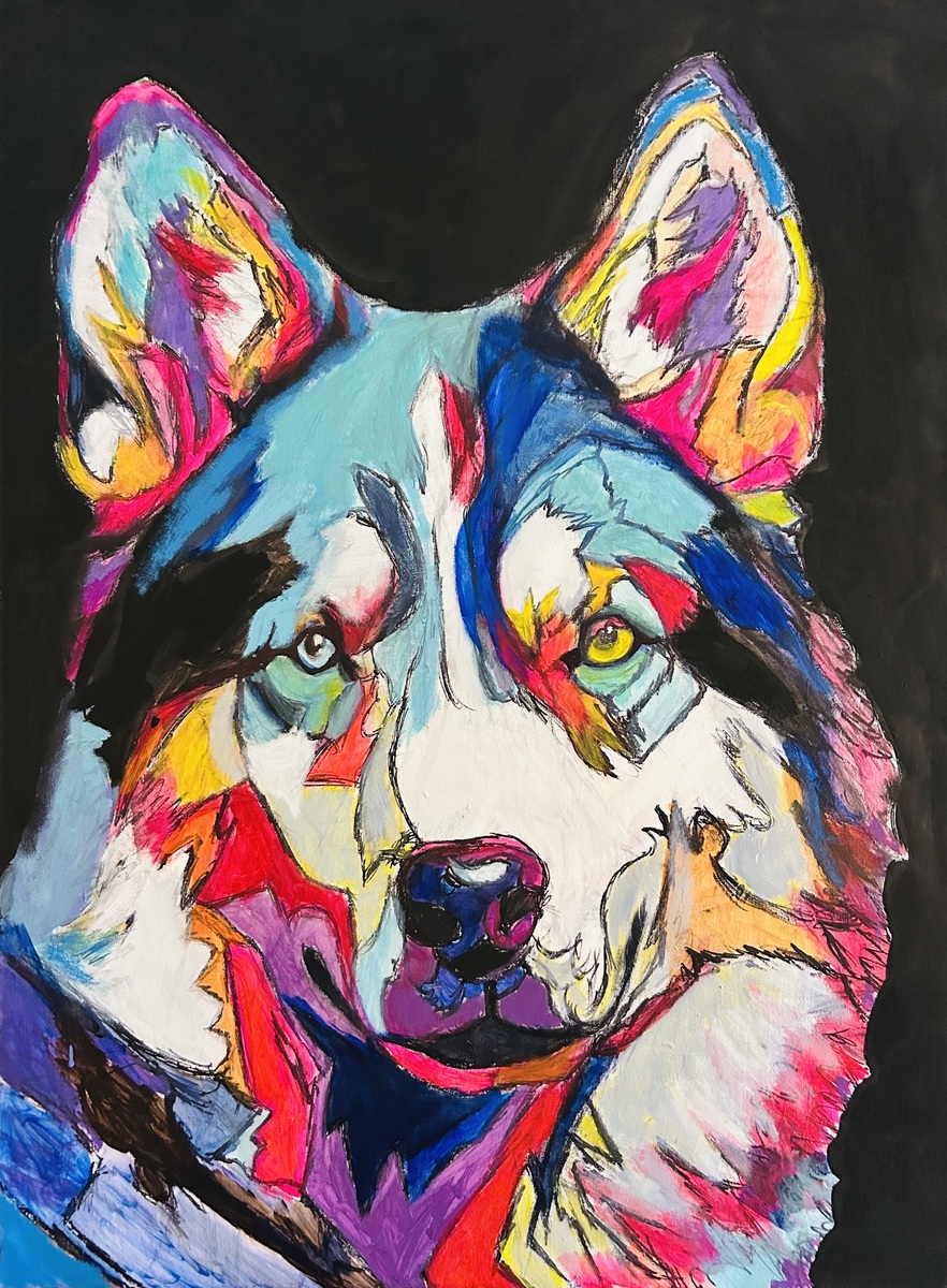 This vibrant acrylic painting is a colorful, impressionist portrait of a husky rendered with bold, expressive brushstrokes and a vivid palette of blues, pinks, yellows, reds, and purples against a black background. The artist captures the animal’s expressive eyes and characteristic facial features while infusing the work with energetic color contrasts that celebrate the beauty of the subject and convey joy.
