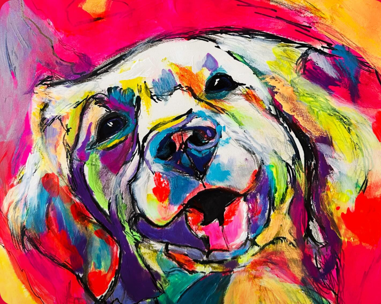 Black outlines sharpen the facial features-eyes, nose, and mouth-giving the subject a lively, almost animated expression. The background bursts with hot pink and orange hues that amplify the energetic atmosphere, emphasizing the artist’s focus on colorful, joyful pet portraiture.