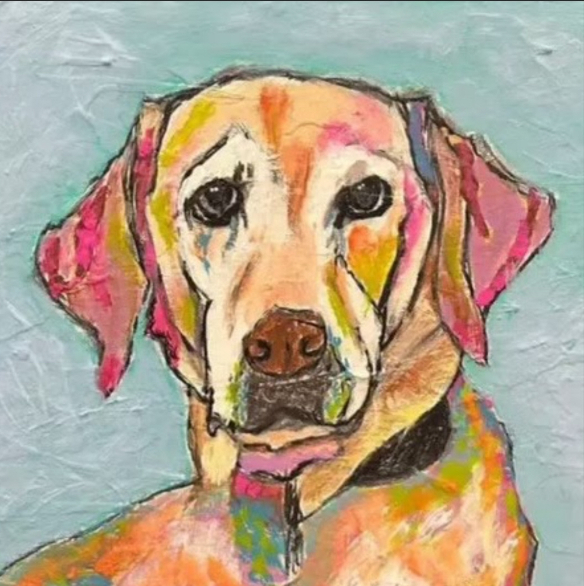The painting is a vibrant acrylic portrait of a dog, rendered in an impressionist style with bold, colorful brushstrokes that highlight the animal’s facial features. The dog has a light tan coat with expressive pink, yellow, orange, and blue accents on its ears and muzzle, giving the piece a lively, textured appearance. The background is a soft teal-blue, focusing attention on the subject. The artwork blends realistic anatomy with energetic color choices, capturing the personality of the pet in a joyful, modern interpretation of impressionism.