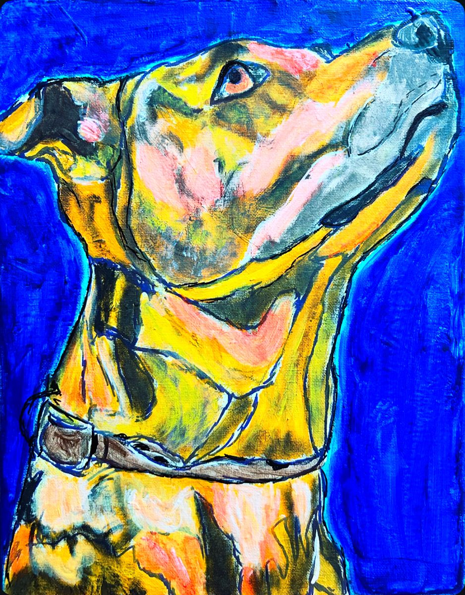 The image depicts an expressive, colorful painting of a yellow dog with a brown collar, rendered in a bold, abstract style against a vibrant blue background. The dog is shown looking upward with its head tilted back.