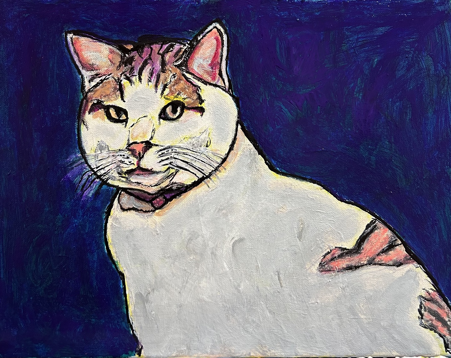 The painting is an acrylic portrait of a white cat with orange tabby markings on its head and tail, set against a deep blue background. The cat is depicted in a three-quarter view, looking slightly left with expressive eyes and a subtle pink collar.