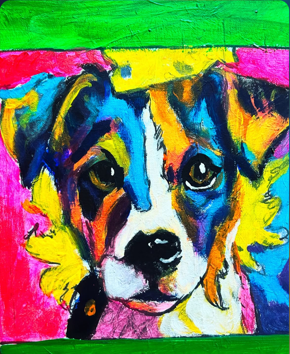 The painting is a vibrant acrylic portrait of a puppy rendered in an impressionist style. The dog’s face is centered on a bright pink background framed by a green border at the top and bottom. Bold, expressive brushstrokes of yellow, blue, orange, and white create a colorful, textured depiction of the puppy’s fur and features, emphasizing energetic color contrasts typical of vivid, modern pet portraiture.
