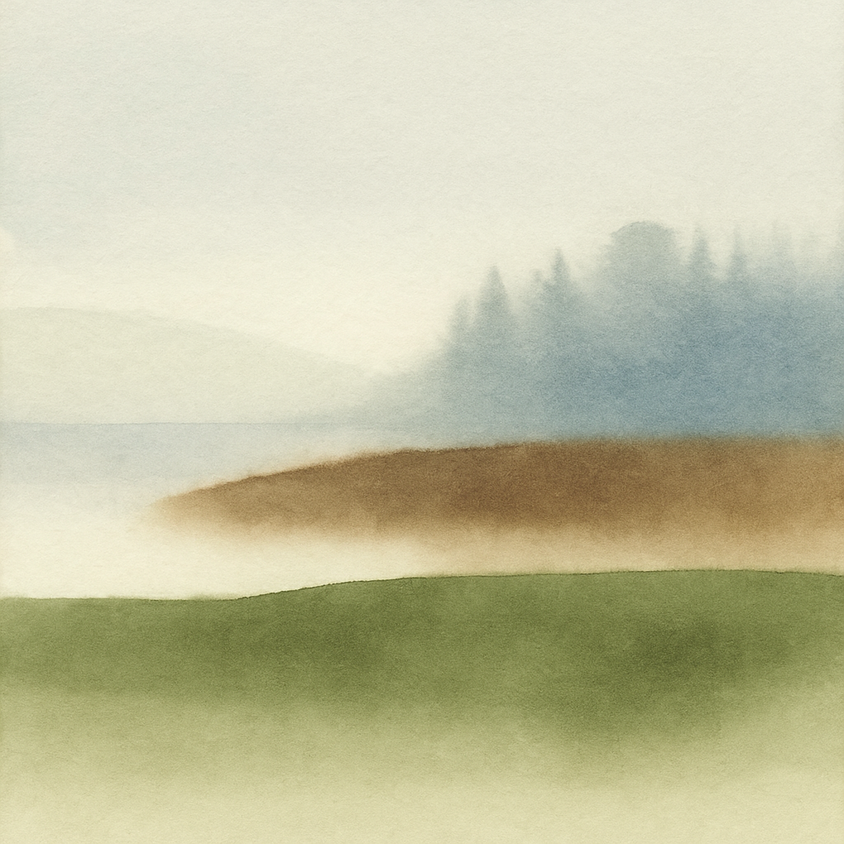 Morning Veil captures the soft awakening of a Nordic landscape as mist drifts gently across land and water. Subtle layers of avocado green, burnt umber, and soft blue-grey merge in delicate watercolor gradients, creating a serene interplay between forest, earth, and sky.