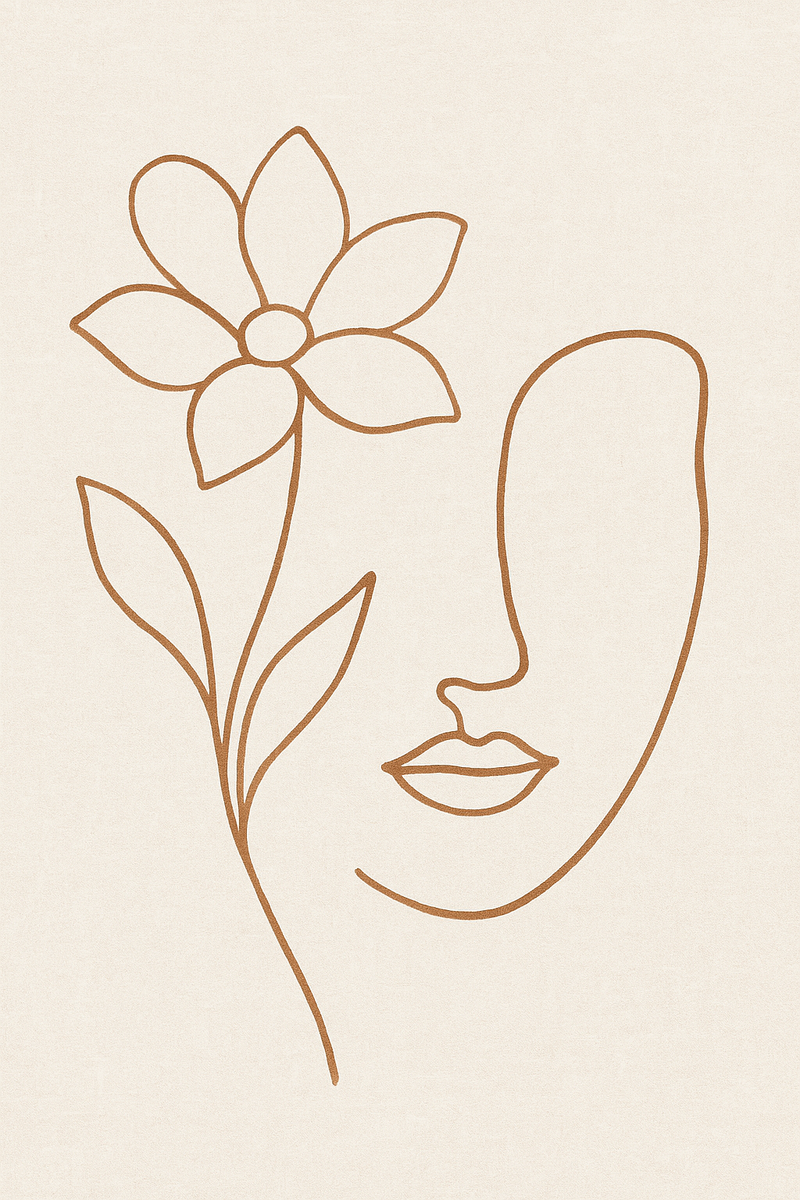 Petal Form presents a delicate composition of a single flower drawn with a continuous burnt umber line. Free of facial elements, the artwork focuses purely on the gentle rhythm of nature — the curve of the stem, the grace of the leaves, and the symmetry of its petals. Set against a soft warm sand background, the piece embodies balance, simplicity, and organic harmony, pairing beautifully with Bloom of Calm in a serene Scandinavian or Japandi-inspired space.