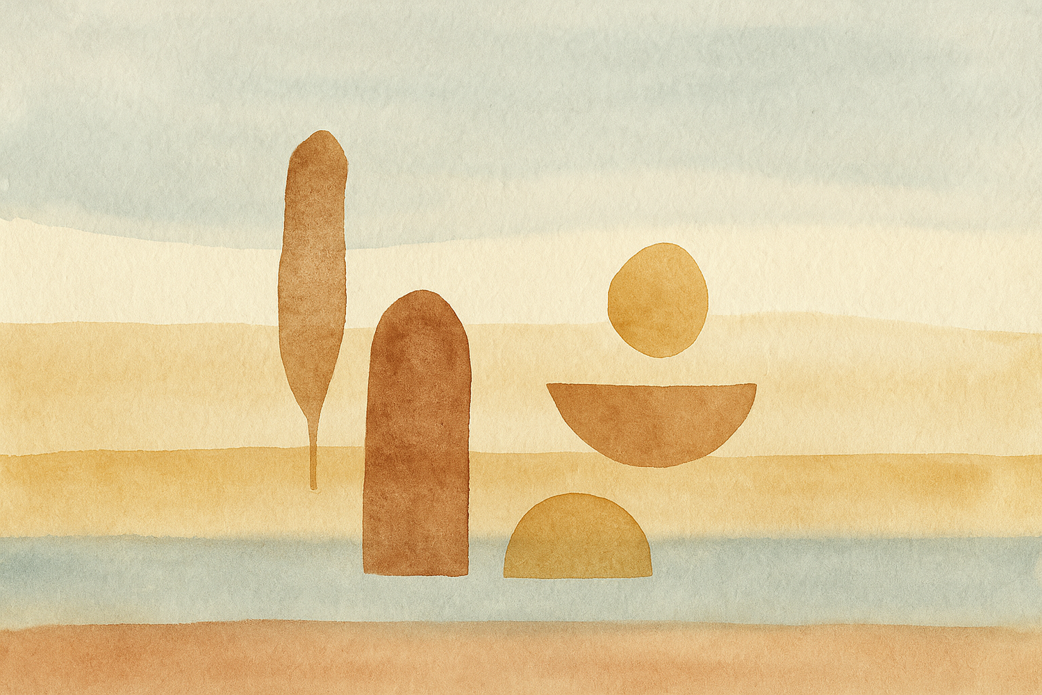 The final piece in the Nordic Haze Collection, Still Balance celebrates harmony through minimalist form and tone. Soft watercolor layers of butter, warm sand, nutmeg, and soft blue evoke a serene horizon, while abstract geometric elements — arches, ovals, and semi-circles — float in quiet equilibrium. The composition suggests the calm rhythm of nature and the peaceful geometry of Scandinavian design, concluding the series with grounded tranquility.