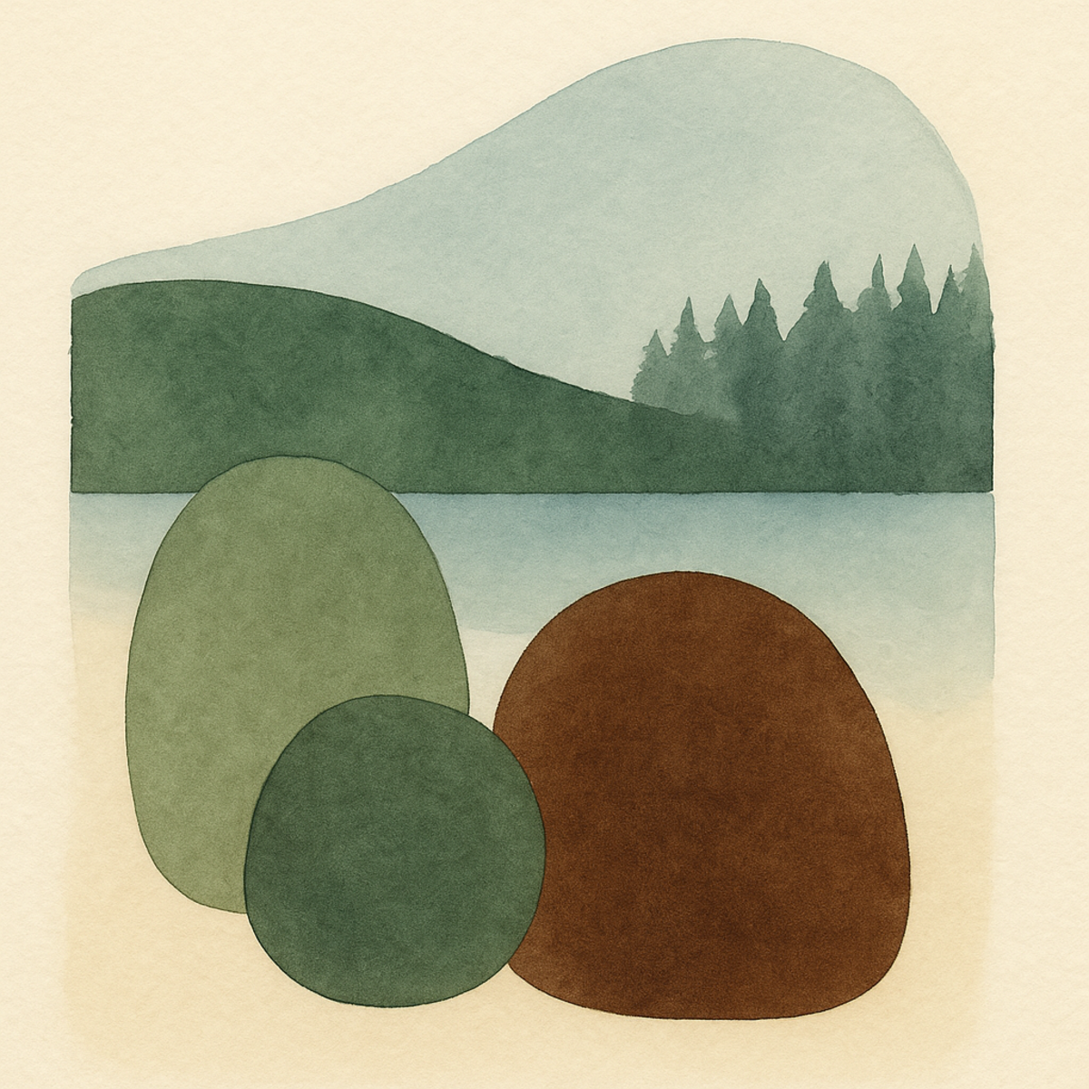 Tranquil Stones evokes the quiet poetry of the natural world through simplified organic forms and harmonious color balance. Rounded shapes in avocado green, burnt umber, and soft blue-grey rest peacefully beside a serene waterline, framed by gentle forest silhouettes and distant hills.